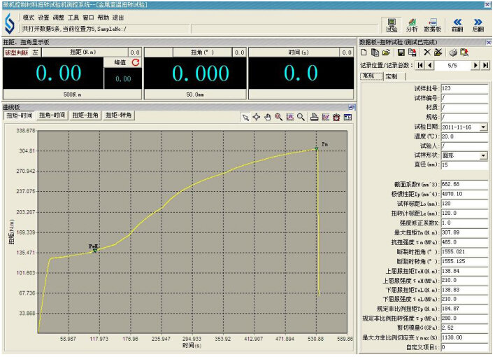 2.1主機(jī):采用臥式結(jié)構(gòu),主體結(jié)構(gòu)采用臥式框架結(jié)構(gòu),以保證整機(jī)的剛性。夾具采用優(yōu)質(zhì)合金結(jié)構(gòu)鋼淬火(HRC45~50)方式,主傳動(dòng)軸采用合金結(jié)構(gòu)鋼淬火處理,保證其使用壽命。試樣的安裝、拆卸方便、快捷。夾頭的活動(dòng)端采用精密重型導(dǎo)軌,使其能自由移動(dòng),將試件的軸向拉力減少到最小。 試件徑向載荷的加載,采用全數(shù)字交流伺服電機(jī)驅(qū)動(dòng),精密行星齒輪減速機(jī)傳動(dòng)方式,使其實(shí)現(xiàn)閉環(huán)控制。加載能力最大10kN。 2.2驅(qū)動(dòng)系統(tǒng):由日本進(jìn)口全數(shù)字交流伺服控制系統(tǒng)驅(qū)動(dòng)。速度調(diào)節(jié)范圍寬,加載均勻、穩(wěn)定。 2.3傳動(dòng)系統(tǒng):采用行星擺線針輪減速器傳動(dòng),保證傳動(dòng)的均勻、穩(wěn)定及傳動(dòng)精度。橫向空間0~600mm范圍內(nèi)任意手動(dòng)調(diào)節(jié)。徑向載荷的加載位置,可以在試件的長(zhǎng)度范圍內(nèi)隨意調(diào)整。 2.4測(cè)量顯示系統(tǒng):該機(jī)采用光電編碼器采集試樣的扭轉(zhuǎn)角度,高精度扭矩傳感器采集試樣的扭矩,高精度扭轉(zhuǎn)計(jì)測(cè)量試樣的扭轉(zhuǎn)變形。計(jì)算機(jī)屏幕顯示試樣的扭矩、扭轉(zhuǎn)角度、扭轉(zhuǎn)變形以及各類曲線等。也可以顯示扭矩—徑向載荷曲線。 2.5軟件操作: ①控制模式采用智能專家設(shè)置系統(tǒng),用戶可以根據(jù)自己的實(shí)際要求編制試驗(yàn)過(guò)程控制方式,自動(dòng)完成試驗(yàn)。 ② WinXP全中文界面,人機(jī)對(duì)話方式。試驗(yàn)的全部操作均借助鍵盤及鼠標(biāo)操作,通過(guò)計(jì)算機(jī)鍵盤與鼠標(biāo)完成,計(jì)算機(jī)屏幕顯示試驗(yàn)扭矩T,扭轉(zhuǎn)角度θ,各種試驗(yàn)曲線(扭矩—徑向載荷、扭矩-時(shí)間曲線、扭矩-角度曲線、角度-時(shí)間曲線等)試驗(yàn)機(jī)工作狀態(tài)等。 ③曲線坐標(biāo)的大小可以根據(jù)實(shí)際的試驗(yàn)數(shù)據(jù)進(jìn)行調(diào)整。 ④輸出打印各種試驗(yàn)報(bào)表格式(報(bào)表格式可以Excel或Word格式輸出)。 ⑤符合JB/T9370—1999《扭轉(zhuǎn)試驗(yàn)機(jī)技術(shù)條件》及GB/T10128—2007《金屬室溫扭轉(zhuǎn)試驗(yàn)方法》數(shù)據(jù)處理的相關(guān)要求。 ⑥可以檢測(cè)試件的屈服點(diǎn)τs、上屈服點(diǎn)τsu、下屈服點(diǎn)τsl、抗扭強(qiáng)度τb等。扭矩和扭轉(zhuǎn)角自動(dòng)跟蹤測(cè)量,并顯示試驗(yàn)曲線。顯示試驗(yàn)的扭矩值、扭轉(zhuǎn)角、扭轉(zhuǎn)速度。 試驗(yàn)結(jié)束后,自動(dòng)進(jìn)行試驗(yàn)數(shù)據(jù)處理,能自動(dòng)求取材料的切變模量G、規(guī)定非比例扭轉(zhuǎn)應(yīng)力τp、屈服點(diǎn)、上屈服點(diǎn)τsu、下屈服點(diǎn)τsl、抗扭強(qiáng)度τb等性能參數(shù)。能根據(jù)用戶要求可隨意編制報(bào)告格式并可輸出打印試驗(yàn)報(bào)告。 ★試驗(yàn)過(guò)程可以實(shí)現(xiàn)模擬再現(xiàn)。 ★試驗(yàn)機(jī)可以實(shí)現(xiàn)連續(xù)加載和任何負(fù)荷下保持載荷兩種功能。試驗(yàn)過(guò)程中無(wú)沖擊和震動(dòng),具有良好的讀數(shù)穩(wěn)定性。 ★可以任意多條試驗(yàn)曲線疊加對(duì)比、輸出打印。 ★可以進(jìn)行數(shù)字化調(diào)零和標(biāo)定。 ★試驗(yàn)數(shù)據(jù)采用數(shù)據(jù)庫(kù)管理方式,便于查詢和維護(hù)。 ★軟件系統(tǒng)的操作可以實(shí)現(xiàn)三級(jí)用戶管理,安全、方便、快捷。 試驗(yàn)操作界面如下: